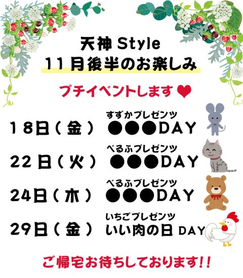 ✨✨✨速報✨✨✨ 🎀天神Style 11月後半のお楽しみ🎀 プチイベント開催します!! 各日どのような催しになるかお楽しみに☺️💕 https://t.co/kdsQ5OqkuH