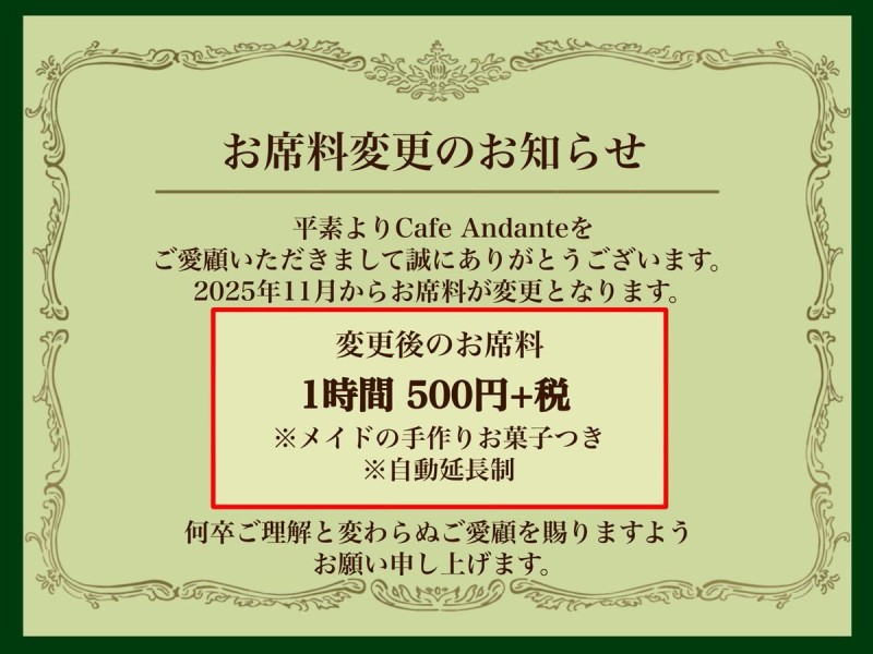| 営業時間 | 平日15時〜22時。土日祝12時〜22時。不定期で営業時間が変わる場合がございます。詳しくは下記スケジュール表をご確認下さいhttp://andante.jp/ftschedule221/schedule.cgi | ||||||||||||||