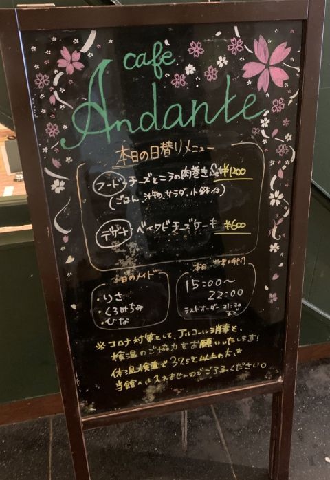 | 営業時間 | 平日15時〜22時。土日祝12時〜22時。不定期で営業時間が変わる場合がございます。詳しくは下記スケジュール表をご確認下さいhttp://andante.jp/ftschedule221/schedule.cgi | ||||||||||||||