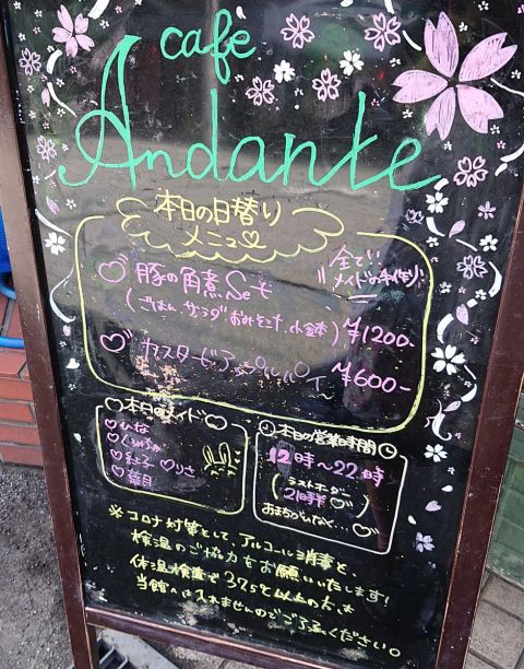 | 営業時間 | 平日15時〜22時。土日祝12時〜22時。不定期で営業時間が変わる場合がございます。詳しくは下記スケジュール表をご確認下さいhttp://andante.jp/ftschedule221/schedule.cgi | ||||||||||||||