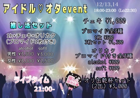 12/8(月)、9(火) 2日間を休業日とさせていただきます。 10日(水)18時からの営業となりますのでよろしくお願いします。 たくさんのご来店、お待ちしてます! 近日イベント予定 12/13,14 アイドル・オタeve 12/21 ももめろ生誕 eve https://t.co/jwWKCfQf53