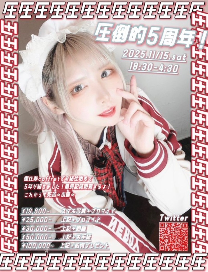 11/15(土)18:30~4:30(Lo.4:00)✨ ちょこ5周年イベント🍫❤️‍🔥 ちょこ/めめ/なぎさ/まりな/まよい?? オリジナルシャンパン🍾🧡✨ イベント記念チェキ📸 #メイド喫茶 #メイドカフェ #コンカフェ #コンセプトカフェ #バイト #募集 #応募 #恵比寿 #渋谷 #東京 https://t.co/RVMxLdfEhV