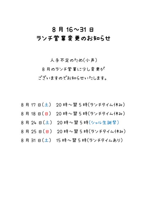 【8月後半ランチ営業日のお知らせ】