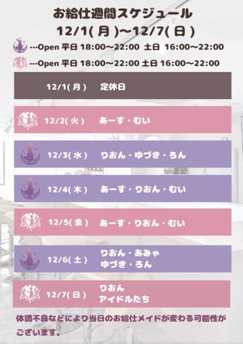 | 営業時間 | *火曜日~金曜日*18:00~23:00 *土曜日、日曜日*16:00~23:00 *月曜日、木曜日*定休日 (イベントなどで営業時間が変わることがあります。) | ||||||||||||||