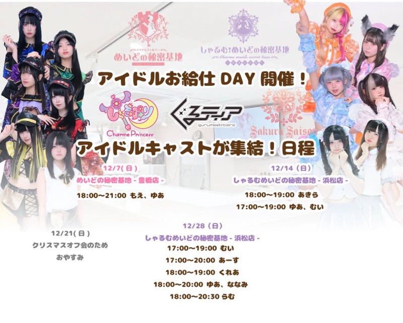 11/15(土)がアイドルイベントの都合でおやすみになります🙇‍♀️ かわりに豊橋店のめいどさん達と浜松店のめいどさんと一緒にやる合同企画を考えました!是非お越しください! https://t.co/anccNZzbhb