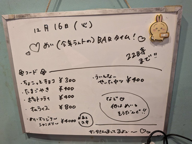 | 営業時間 | <平日> ●カフェタイム12:00〜18:00 ●バータイム18:00〜23:00 <土日祝> ●カフェタイム11:00〜18:00 ●バータイム18:00〜23:00 | ||||||||||||||