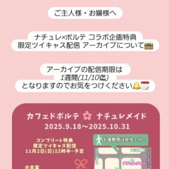 ご䞻人様・お嬢様 ごきげんよう🍁 開通しおおりたす 10月18日(土) ナチュレ(@naturemaid_)×ポルテコラボ 衣装亀換👗✚ 【 OPEN 13:00CLOSE 21:00 】 LO FOOD 20:00 DRINKDESSERT 20:30 各皮ご予玄も通内にお受付䞭です✅ お垰りを心よりお埅ちしおおりたす🏡 https://t.co/K4qg9agDvT