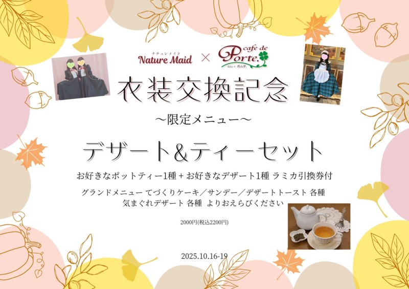 ご䞻人様・お嬢様 ごきげんよう🍁 開通しおおりたす 10月18日(土) ナチュレ(@naturemaid_)×ポルテコラボ 衣装亀換👗✚ 【 OPEN 13:00CLOSE 21:00 】 LO FOOD 20:00 DRINKDESSERT 20:30 各皮ご予玄も通内にお受付䞭です✅ お垰りを心よりお埅ちしおおりたす🏡 https://t.co/K4qg9agDvT