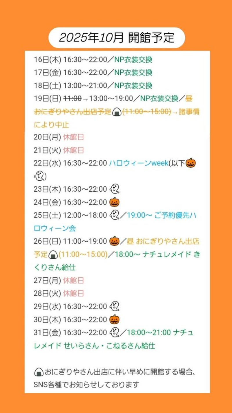 本日もありがずうございたした🌃 10月19日(日)は  ナチュレ(@naturemaid_)×ポルテコラボ 衣装亀換🎀最終日 【 OPEN 13:00CLOSE 19:00 】 おにぎりやさん出店䞭止に䌎い通垞時のOPEN時間です🔔お気を぀けください 明日も「 ただいた 」のお声を心よりお埅ちしおおりたす🏡 https://t.co/IPqsT70j1M