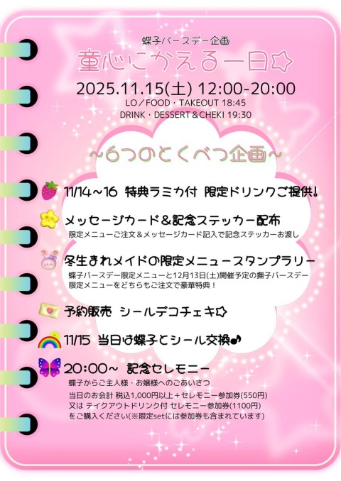 ご䞻人様・お嬢様 ごきげんよう🌞 11月15日(土) 蝶子バヌスデヌ䌁画の日🊋🎂🎊 【 OPEN 12:00CLOSE 20:00 】 LO FOOD 18:45 DRINKDESSERT 19:30 童心にかえり぀぀みんなで蝶子をお祝いしたしょう🎈🧞🎉 本日もメむド䞀同お垰りを心よりお埅ちしおおりたす🏡 https://t.co/Et1PUKGXbP