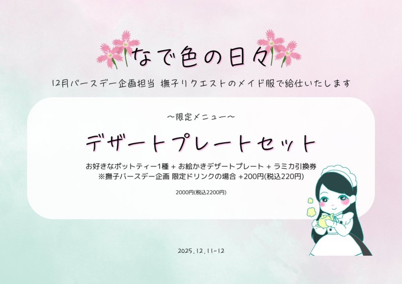 ご䞻人様・お嬢様 ごきげんよう⛄ 開通しおおりたす 12月12日(金) なで色の日々🌞 【 OPEN 16:30CLOSE 22:00 】 LO FOOD 21:00 DRINKDESSERT 21:30 バヌスデヌ䌁画も倧詰め❣本日も撫子リク゚ストのメむド服で絊仕いたしたす🎀 お垰りを心よりお埅ちしおおりたす🏡 https://t.co/0RFGbpiiA9
