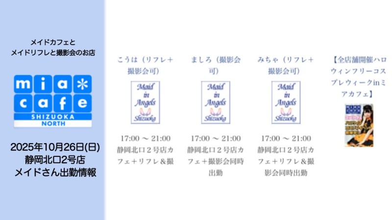 | å¶æ¥æé | é岡åºã¯åºå€ã¹ã¿ãããããã°å¶æ¥ã§ãïŒ åºæ¬çã«ã12æïœ22æãå¶æ¥æéã§ãïŒ âé岡åºã®ãã€ãã¿ãŒã@shizuokamaidsan https://twitter.com/shizuokamaidsan âãã¢é岡åºã®å¶æ¥ææ¥ïŒå¶æ¥æéâ âæãæšã14:00ã22:00(æçµåä»20:00) âéææ¥ã12:00ã22:00(æçµåä»21:00) âåã»æ¥ã»ç¥ã12:00ã22:00(æçµåä»21:00) å¶æ¥æéå€ã¯ãªã³ã©ã€ã³äºçŽã«ãŠãé¡ãããããŸãã ïŒ°ïŒ£ã»æºåž¯å ±éãâãhttp://m-kanzume.moo.jp/yoyaku2/user.cgi âãã¢ã¬ã€ãåºå€ç¶æ³â ã¹ããã»ïŒ°ïŒ£ãâãåŸæ¥å ¬éäºå® â é岡åºã¹ã¿ããã«ãããã¢ç²åºåºã§ã®ã¡ã€ãã«ãã§ãªã¢ã«å¶æ¥â âäžå®æ ããµã€ãã«ãŠã確èªãã ããã ãhttp://market.chu.jp/schedule1/sche37.cgi | ||||||||||||||