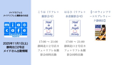 | å¶æ¥æé | é岡åºã¯åºå€ã¹ã¿ãããããã°å¶æ¥ã§ãïŒ åºæ¬çã«ã12æïœ22æãå¶æ¥æéã§ãïŒ âé岡åºã®ãã€ãã¿ãŒã@shizuokamaidsan https://twitter.com/shizuokamaidsan âãã¢é岡åºã®å¶æ¥ææ¥ïŒå¶æ¥æéâ âæãæšã14:00ã22:00(æçµåä»20:00) âéææ¥ã12:00ã22:00(æçµåä»21:00) âåã»æ¥ã»ç¥ã12:00ã22:00(æçµåä»21:00) å¶æ¥æéå€ã¯ãªã³ã©ã€ã³äºçŽã«ãŠãé¡ãããããŸãã ïŒ°ïŒ£ã»æºåž¯å ±éãâãhttp://m-kanzume.moo.jp/yoyaku2/user.cgi âãã¢ã¬ã€ãåºå€ç¶æ³â ã¹ããã»ïŒ°ïŒ£ãâãåŸæ¥å ¬éäºå® â é岡åºã¹ã¿ããã«ãããã¢ç²åºåºã§ã®ã¡ã€ãã«ãã§ãªã¢ã«å¶æ¥â âäžå®æ ããµã€ãã«ãŠã確èªãã ããã ãhttp://market.chu.jp/schedule1/sche37.cgi | ||||||||||||||