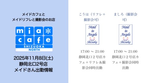 | å¶æ¥æé | é岡åºã¯åºå€ã¹ã¿ãããããã°å¶æ¥ã§ãïŒ åºæ¬çã«ã12æïœ22æãå¶æ¥æéã§ãïŒ âé岡åºã®ãã€ãã¿ãŒã@shizuokamaidsan https://twitter.com/shizuokamaidsan âãã¢é岡åºã®å¶æ¥ææ¥ïŒå¶æ¥æéâ âæãæšã14:00ã22:00(æçµåä»20:00) âéææ¥ã12:00ã22:00(æçµåä»21:00) âåã»æ¥ã»ç¥ã12:00ã22:00(æçµåä»21:00) å¶æ¥æéå€ã¯ãªã³ã©ã€ã³äºçŽã«ãŠãé¡ãããããŸãã ïŒ°ïŒ£ã»æºåž¯å ±éãâãhttp://m-kanzume.moo.jp/yoyaku2/user.cgi âãã¢ã¬ã€ãåºå€ç¶æ³â ã¹ããã»ïŒ°ïŒ£ãâãåŸæ¥å ¬éäºå® â é岡åºã¹ã¿ããã«ãããã¢ç²åºåºã§ã®ã¡ã€ãã«ãã§ãªã¢ã«å¶æ¥â âäžå®æ ããµã€ãã«ãŠã確èªãã ããã ãhttp://market.chu.jp/schedule1/sche37.cgi | ||||||||||||||