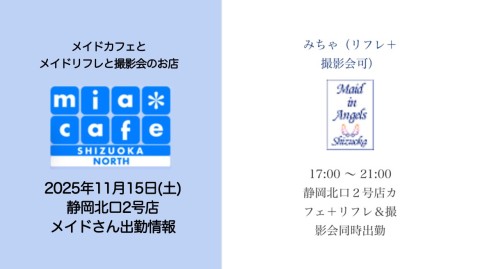 #メむドカフェ ●ミアカフェ静岡北口号店● 静岡垂葵区䞡替町1-5-7 チサンマンション䞡替町・光進䞡替町ビル階  054-330-8100 #メむドリフレ #撮圱䌚 ●ミアリラフォト静岡北口店● 葵区䞃間町3-4 䞃間町ハむム マップ https://t.co/AgUKuZXZ49 出勀 https://t.co/ivGxFp2T7x https://t.co/TRf1xcDX15