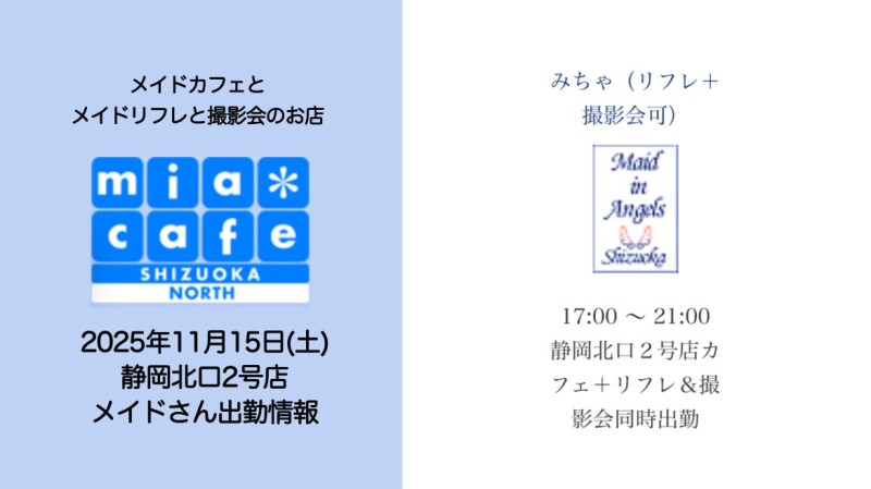 ★#メむドカフェ ・ #ミアカフェ #静岡 北口号店★ ☕営業予定日☕ 💖11月15日(土) 17-21 みちゃ 💖11月16日(日) 17-21 あおね・えみりあ・こうは 🚚ポリスむベント🚚 🚚11月22日(土) 17-21 たしろ・みちゃ 🚚11月23日(日) 17-21 あおね・みちゃ 💖11月29日(土) 17-21 みちゃ #コンカフェ https://t.co/8YrP0R97Yy