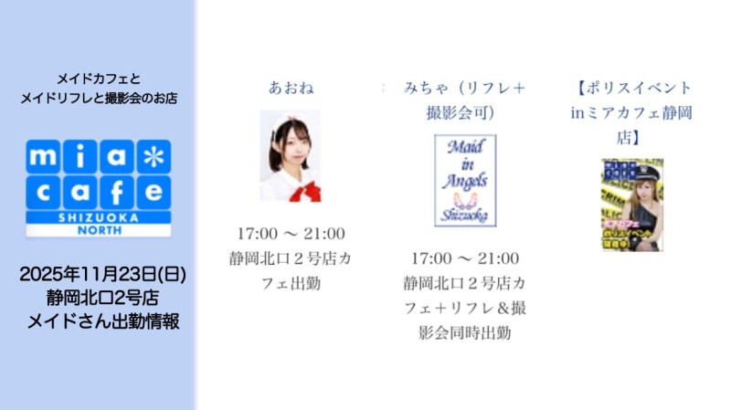 | å¶æ¥æé | é岡åºã¯åºå€ã¹ã¿ãããããã°å¶æ¥ã§ãïŒ åºæ¬çã«ã12æïœ22æãå¶æ¥æéã§ãïŒ âé岡åºã®ãã€ãã¿ãŒã@shizuokamaidsan https://twitter.com/shizuokamaidsan âãã¢é岡åºã®å¶æ¥ææ¥ïŒå¶æ¥æéâ âæãæšã14:00ã22:00(æçµåä»20:00) âéææ¥ã12:00ã22:00(æçµåä»21:00) âåã»æ¥ã»ç¥ã12:00ã22:00(æçµåä»21:00) å¶æ¥æéå€ã¯ãªã³ã©ã€ã³äºçŽã«ãŠãé¡ãããããŸãã ïŒ°ïŒ£ã»æºåž¯å ±éãâãhttp://m-kanzume.moo.jp/yoyaku2/user.cgi âãã¢ã¬ã€ãåºå€ç¶æ³â ã¹ããã»ïŒ°ïŒ£ãâãåŸæ¥å ¬éäºå® â é岡åºã¹ã¿ããã«ãããã¢ç²åºåºã§ã®ã¡ã€ãã«ãã§ãªã¢ã«å¶æ¥â âäžå®æ ããµã€ãã«ãŠã確èªãã ããã ãhttp://market.chu.jp/schedule1/sche37.cgi | ||||||||||||||
