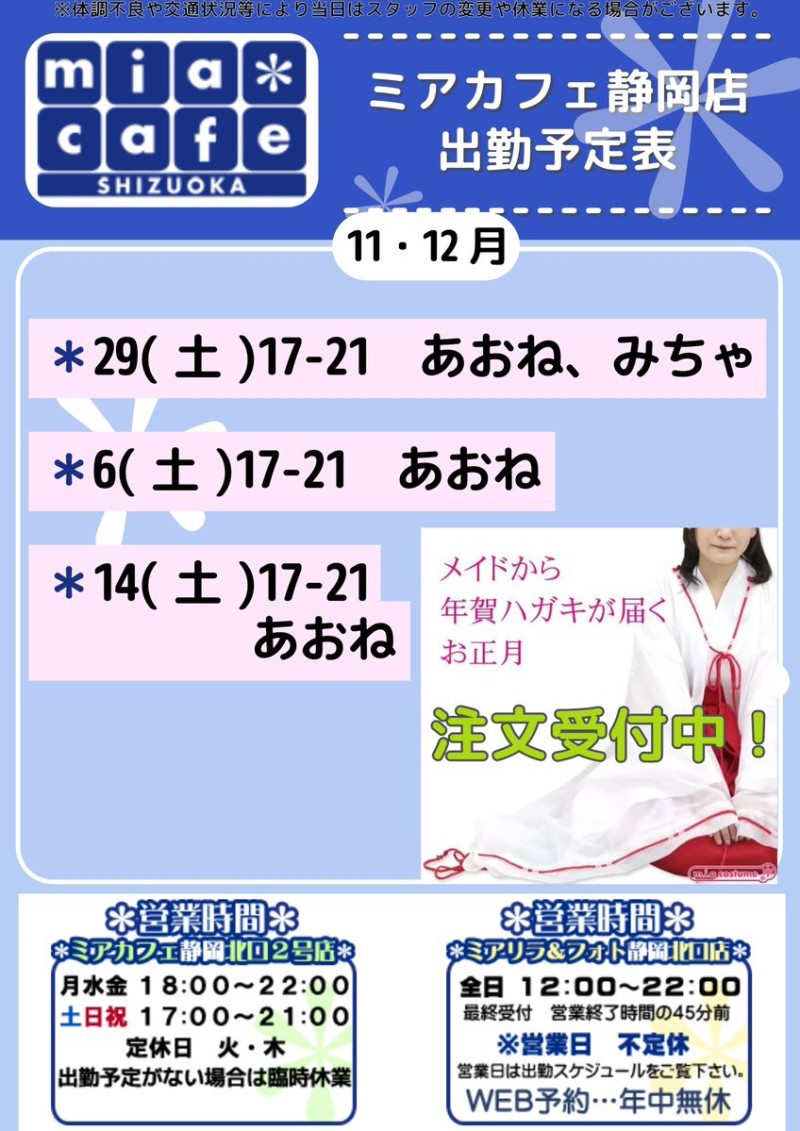 | å¶æ¥æé | é岡åºã¯åºå€ã¹ã¿ãããããã°å¶æ¥ã§ãïŒ åºæ¬çã«ã12æïœ22æãå¶æ¥æéã§ãïŒ âé岡åºã®ãã€ãã¿ãŒã@shizuokamaidsan https://twitter.com/shizuokamaidsan âãã¢é岡åºã®å¶æ¥ææ¥ïŒå¶æ¥æéâ âæãæšã14:00ã22:00(æçµåä»20:00) âéææ¥ã12:00ã22:00(æçµåä»21:00) âåã»æ¥ã»ç¥ã12:00ã22:00(æçµåä»21:00) å¶æ¥æéå€ã¯ãªã³ã©ã€ã³äºçŽã«ãŠãé¡ãããããŸãã ïŒ°ïŒ£ã»æºåž¯å ±éãâãhttp://m-kanzume.moo.jp/yoyaku2/user.cgi âãã¢ã¬ã€ãåºå€ç¶æ³â ã¹ããã»ïŒ°ïŒ£ãâãåŸæ¥å ¬éäºå® â é岡åºã¹ã¿ããã«ãããã¢ç²åºåºã§ã®ã¡ã€ãã«ãã§ãªã¢ã«å¶æ¥â âäžå®æ ããµã€ãã«ãŠã確èªãã ããã ãhttp://market.chu.jp/schedule1/sche37.cgi | ||||||||||||||
