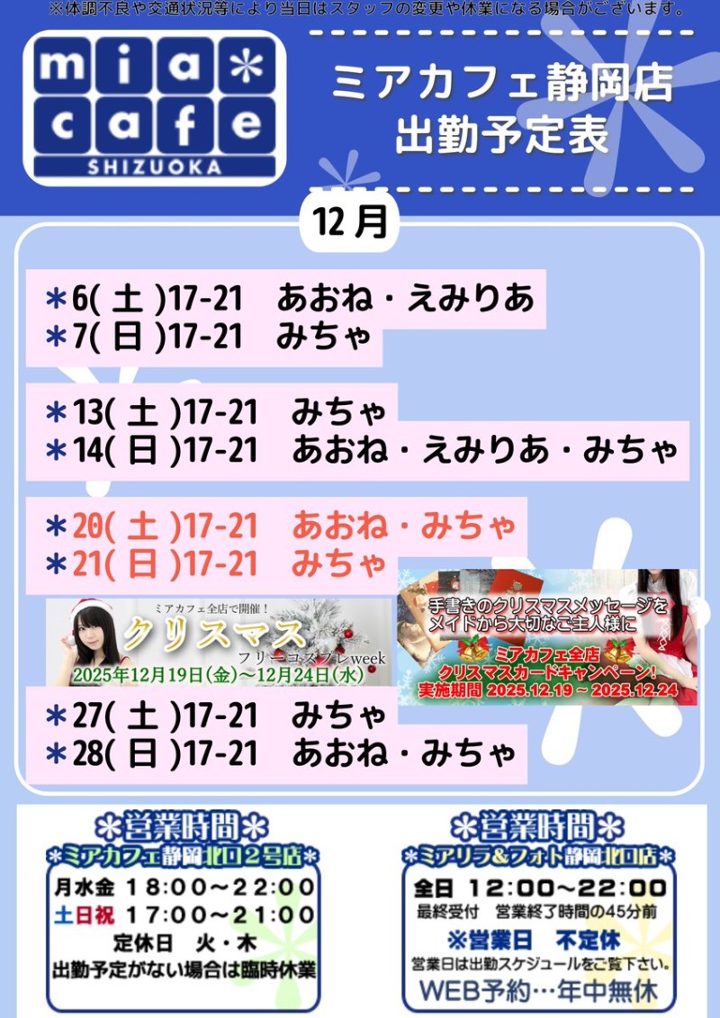 | å¶æ¥æé | é岡åºã¯åºå€ã¹ã¿ãããããã°å¶æ¥ã§ãïŒ åºæ¬çã«ã12æïœ22æãå¶æ¥æéã§ãïŒ âé岡åºã®ãã€ãã¿ãŒã@shizuokamaidsan https://twitter.com/shizuokamaidsan âãã¢é岡åºã®å¶æ¥ææ¥ïŒå¶æ¥æéâ âæãæšã14:00ã22:00(æçµåä»20:00) âéææ¥ã12:00ã22:00(æçµåä»21:00) âåã»æ¥ã»ç¥ã12:00ã22:00(æçµåä»21:00) å¶æ¥æéå€ã¯ãªã³ã©ã€ã³äºçŽã«ãŠãé¡ãããããŸãã ïŒ°ïŒ£ã»æºåž¯å ±éãâãhttp://m-kanzume.moo.jp/yoyaku2/user.cgi âãã¢ã¬ã€ãåºå€ç¶æ³â ã¹ããã»ïŒ°ïŒ£ãâãåŸæ¥å ¬éäºå® â é岡åºã¹ã¿ããã«ãããã¢ç²åºåºã§ã®ã¡ã€ãã«ãã§ãªã¢ã«å¶æ¥â âäžå®æ ããµã€ãã«ãŠã確èªãã ããã ãhttp://market.chu.jp/schedule1/sche37.cgi | ||||||||||||||