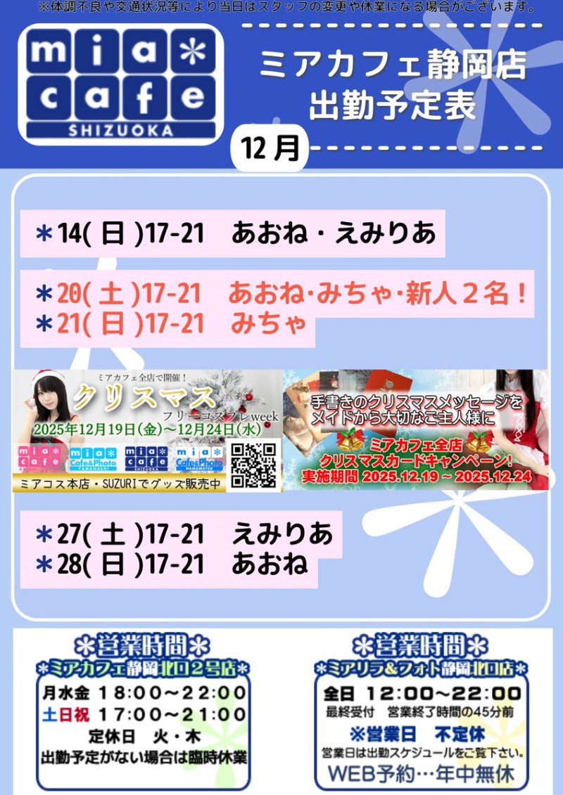 | å¶æ¥æé | é岡åºã¯åºå€ã¹ã¿ãããããã°å¶æ¥ã§ãïŒ åºæ¬çã«ã12æïœ22æãå¶æ¥æéã§ãïŒ âé岡åºã®ãã€ãã¿ãŒã@shizuokamaidsan https://twitter.com/shizuokamaidsan âãã¢é岡åºã®å¶æ¥ææ¥ïŒå¶æ¥æéâ âæãæšã14:00ã22:00(æçµåä»20:00) âéææ¥ã12:00ã22:00(æçµåä»21:00) âåã»æ¥ã»ç¥ã12:00ã22:00(æçµåä»21:00) å¶æ¥æéå€ã¯ãªã³ã©ã€ã³äºçŽã«ãŠãé¡ãããããŸãã ïŒ°ïŒ£ã»æºåž¯å ±éãâãhttp://m-kanzume.moo.jp/yoyaku2/user.cgi âãã¢ã¬ã€ãåºå€ç¶æ³â ã¹ããã»ïŒ°ïŒ£ãâãåŸæ¥å ¬éäºå® â é岡åºã¹ã¿ããã«ãããã¢ç²åºåºã§ã®ã¡ã€ãã«ãã§ãªã¢ã«å¶æ¥â âäžå®æ ããµã€ãã«ãŠã確èªãã ããã ãhttp://market.chu.jp/schedule1/sche37.cgi | ||||||||||||||
