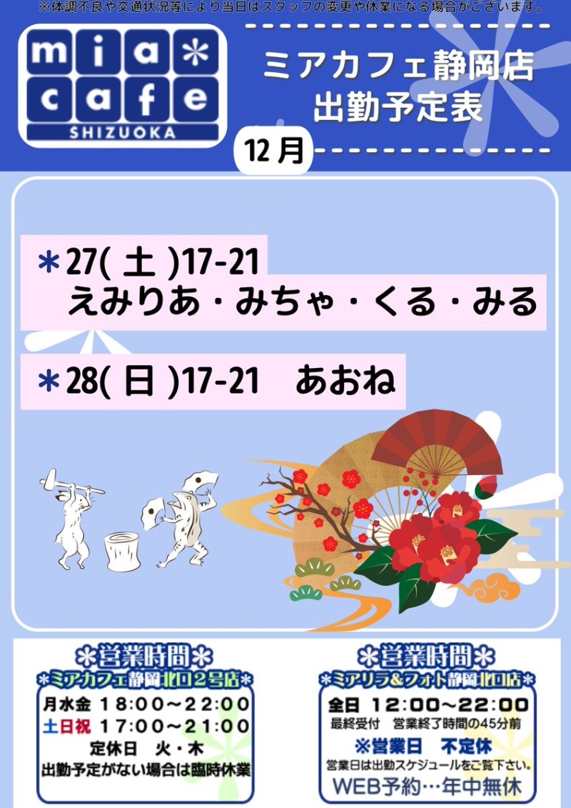 | å¶æ¥æé | é岡åºã¯åºå€ã¹ã¿ãããããã°å¶æ¥ã§ãïŒ åºæ¬çã«ã12æïœ22æãå¶æ¥æéã§ãïŒ âé岡åºã®ãã€ãã¿ãŒã@shizuokamaidsan https://twitter.com/shizuokamaidsan âãã¢é岡åºã®å¶æ¥ææ¥ïŒå¶æ¥æéâ âæãæšã14:00ã22:00(æçµåä»20:00) âéææ¥ã12:00ã22:00(æçµåä»21:00) âåã»æ¥ã»ç¥ã12:00ã22:00(æçµåä»21:00) å¶æ¥æéå€ã¯ãªã³ã©ã€ã³äºçŽã«ãŠãé¡ãããããŸãã ïŒ°ïŒ£ã»æºåž¯å ±éãâãhttp://m-kanzume.moo.jp/yoyaku2/user.cgi âãã¢ã¬ã€ãåºå€ç¶æ³â ã¹ããã»ïŒ°ïŒ£ãâãåŸæ¥å ¬éäºå® â é岡åºã¹ã¿ããã«ãããã¢ç²åºåºã§ã®ã¡ã€ãã«ãã§ãªã¢ã«å¶æ¥â âäžå®æ ããµã€ãã«ãŠã確èªãã ããã ãhttp://market.chu.jp/schedule1/sche37.cgi | ||||||||||||||