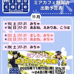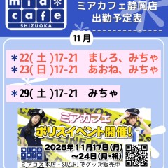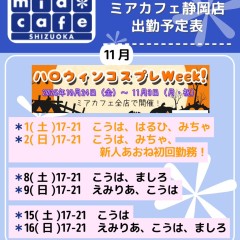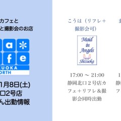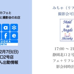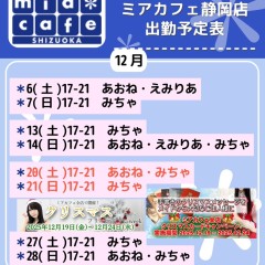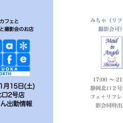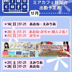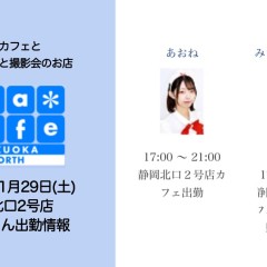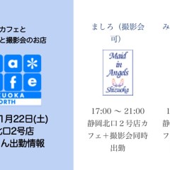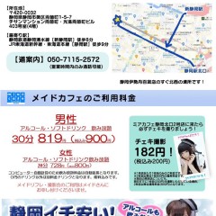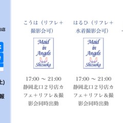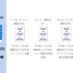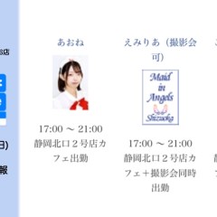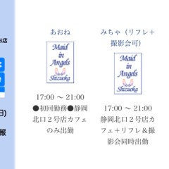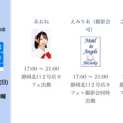 | å¶æ¥æé | é岡åºã¯åºå€ã¹ã¿ãããããã°å¶æ¥ã§ãïŒ åºæ¬çã«ã12æïœ22æãå¶æ¥æéã§ãïŒ âé岡åºã®ãã€ãã¿ãŒã@shizuokamaidsan https://twitter.com/shizuokamaidsan âãã¢é岡åºã®å¶æ¥ææ¥ïŒå¶æ¥æéâ âæãæšã14:00ã22:00(æçµåä»20:00) âéææ¥ã12:00ã22:00(æçµåä»21:00) âåã»æ¥ã»ç¥ã12:00ã22:00(æçµåä»21:00) å¶æ¥æéå€ã¯ãªã³ã©ã€ã³äºçŽã«ãŠãé¡ãããããŸãã ïŒ°ïŒ£ã»æºåž¯å ±éãâãhttp://m-kanzume.moo.jp/yoyaku2/user.cgi âãã¢ã¬ã€ãåºå€ç¶æ³â ã¹ããã»ïŒ°ïŒ£ãâãåŸæ¥å ¬éäºå® â é岡åºã¹ã¿ããã«ãããã¢ç²åºåºã§ã®ã¡ã€ãã«ãã§ãªã¢ã«å¶æ¥â âäžå®æ ããµã€ãã«ãŠã確èªãã ããã ãhttp://market.chu.jp/schedule1/sche37.cgi | ||||||||||||||